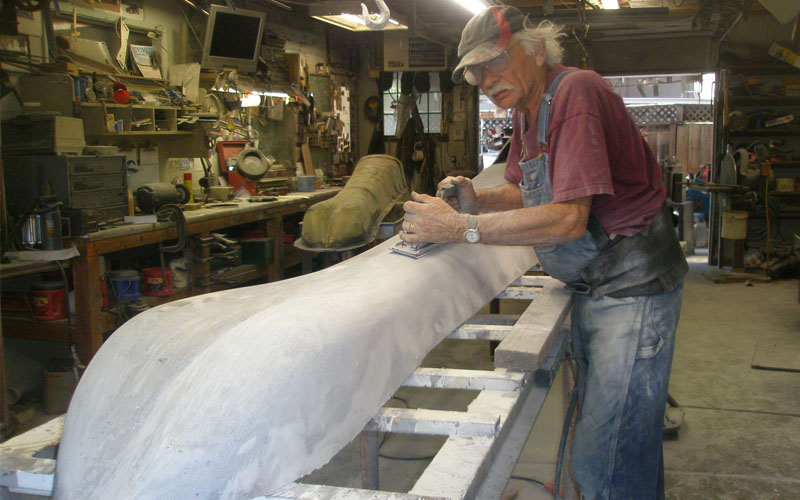At age 20 I went to work in the fiberglass industry, and learned tooling, mold-making, and prototypes. I worked 45 years for several companies’ prototyping boats, cars, and dune buggies. There were various projects in the fiberglass companies that let me exercise my creativity. Before long I went to work for FMC in San Jose, where I still live incidentally. I worked for FMC for 25 years and retired in '97. My job was model maker, prototyping, mold maker, mostly wood work, some metal and fiberglass. I always thought of myself there more as an artist than an engineer. The boss and the engineers come into the shop waving their arms, and we're the fellas that turn ideas and drawings into real parts and structures you can do something with.