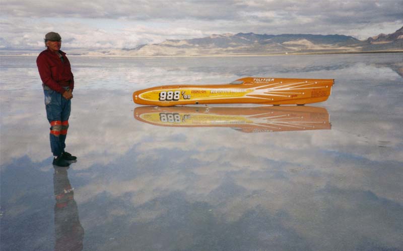 My first experience at Bonneville was in 1969. I built three mini bikes when I worked for Bonanza. We came home with 2 records. By the '80s I had the creative urge for racing again, and in '85 I went to Speed Week and looked over the streamliners. In '89 I built Nebulous Theorem I. I used a Honda V4 motorcycle engine de-bored to 1000cc, with front wheel drive, and tandem rear wheels. I made a twin-turbo system for it with home-made fuel injection and intercoolers. But this first attempt was not successful, the handling was poor at low speeds, it darted back and forth. So I scrubbed this one, and went to Nebulous Theorem II. I think looking back probably nothing was wrong but the steering was too quick, and I likely could have cured it. I built Nebulous Theorem II using the same power unit, but conventional rear wheel drive with a quick-change, and slowed down the steering. In '92 I got the H/BGS Bonneville Record with it at 239. The car is still running today.
